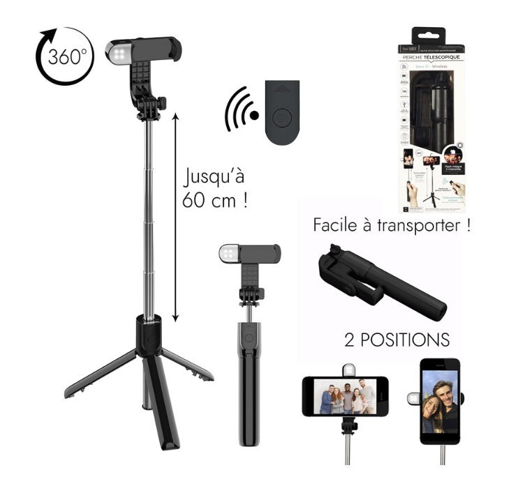 Non perderai più i tuoi selfie con questo palo telescopico senza fili! Dotato di treppiede telecomandato, è allungabile di 60 cm. Aggiungete a ciò una batteria ricaricabile che gli conferisce un'ora di autonomia e un flash integrato e non dubiterete più della sua assoluta necessità! Puoi giocare con l'autoscatto e le 3 intensità del flash per scegliere il tuo profilo migliore. Non esitate a prenderlo perché è, inoltre, compatibile con tutti gli smartphone.